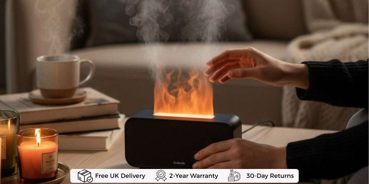 The Calmify's flame effect pairs warm LED lights with an ultra-fine mist, creating a realistic visual illusion of a soft, dancing fire. It brings an immediate sense of cosiness and relaxation to any space, all without generating heat.